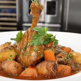 Back in the Dutch oven, add the mushrooms add salt and cook until they have release most of their water. Add the garlic and cook for 1 minutes until it releases it’s fragrance. Add the thyme and rosemary and add the wine and reduce it by half. (This could take 5 minutes). Add carrots, potatoes, add chicken stock salt and pepper to taste.