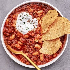 Do Ahead: Chili (without yogurt sauce and tostadas) can be made 3 days ahead. Transfer to an airtight container and chill.